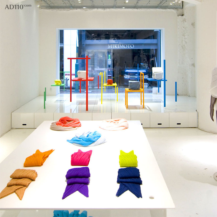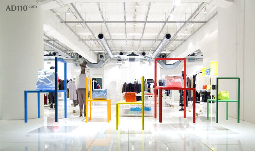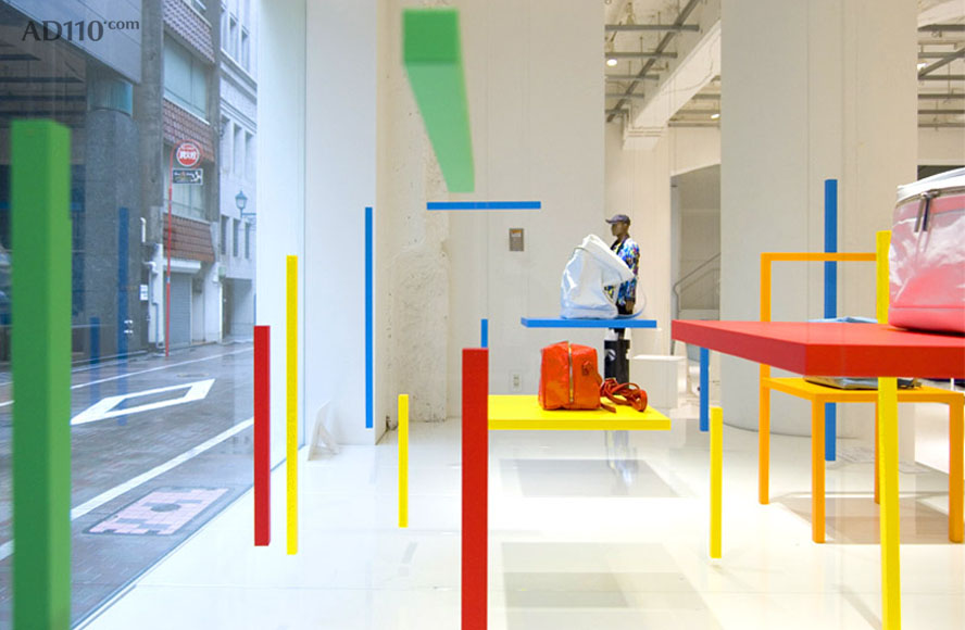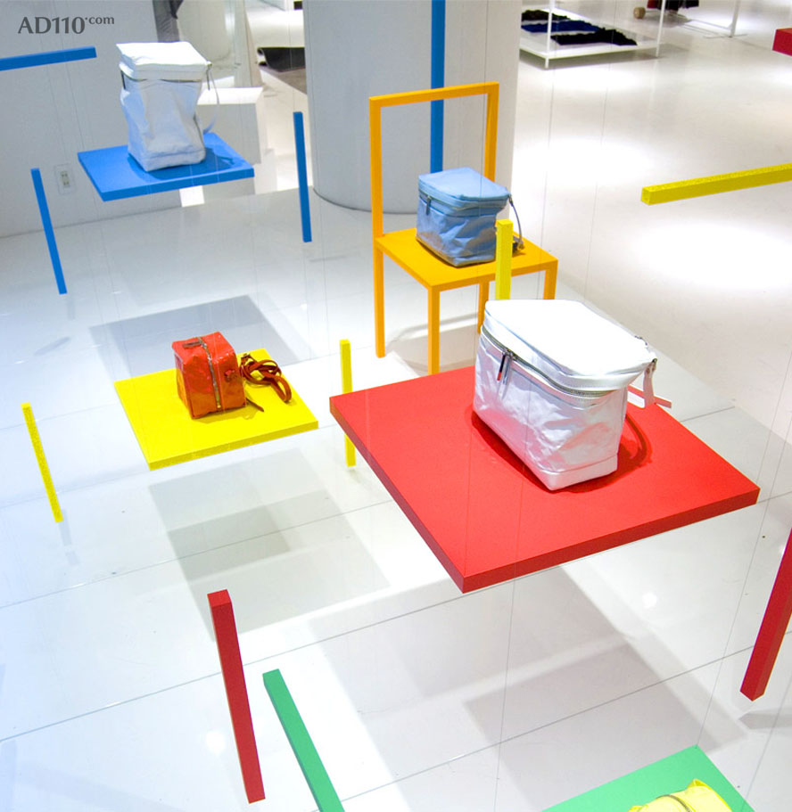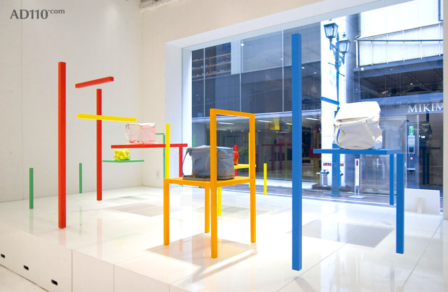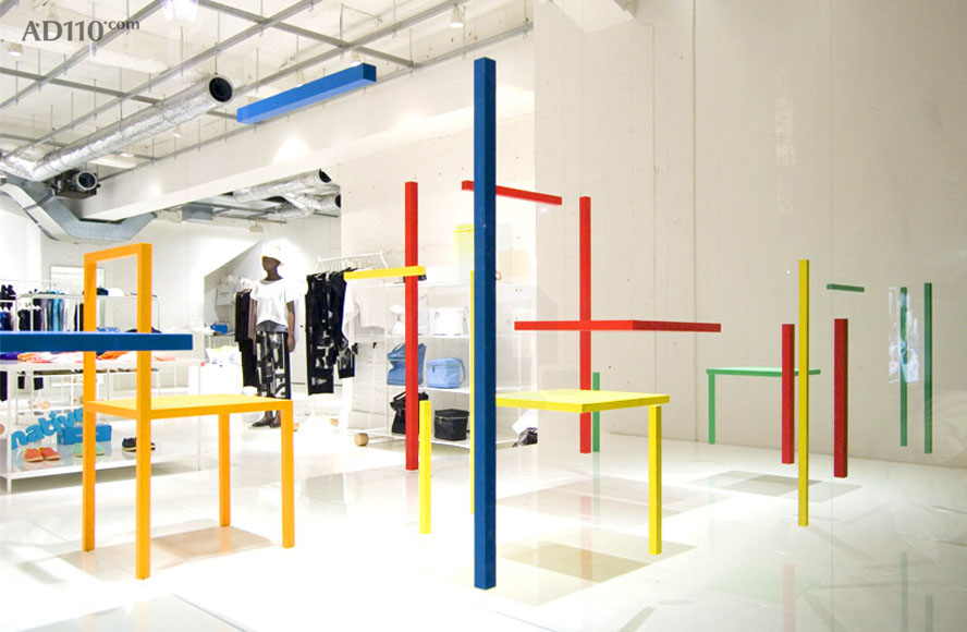 从街道两旁看过来就像是漂浮在空中的线和面,走进橱窗才意识到原来碎片是组合成五张椅子,并且都有各自鲜明的颜色。这个空间设计是基于由二维的布到三维的服装的这样一个过程,给人造成错觉,将极简主义的元素利用到了极致。
