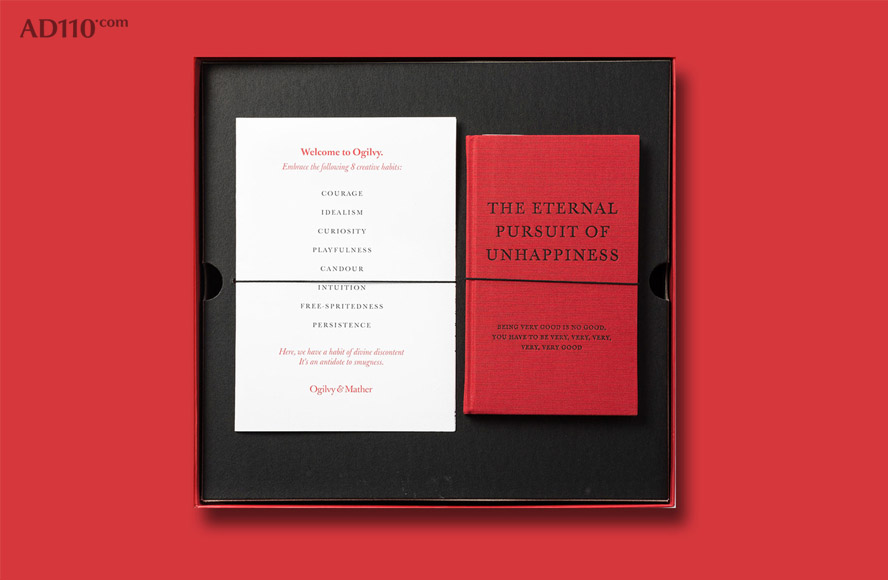 Ogilvy & Mather Induction Box 是给所有新员工的第一份见面礼,里面包含了奥美价值观、奥美员工手册,及日常工作中使用频率较高的“U盘、铅笔”等物件。最重要的是还有奥美红宝书“The Eternal Pursuit of Unhappiness”,帮助新员工快速领会奥美的价值观。看到这个........,知道为什么奥美人会有那么强的归属感了吧?
