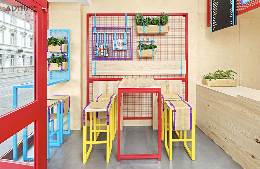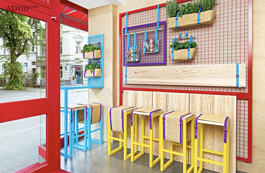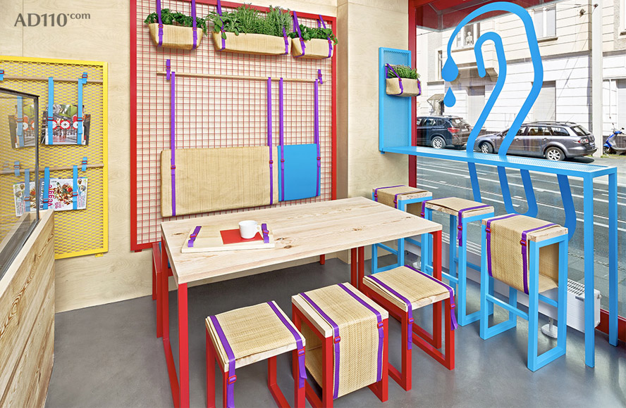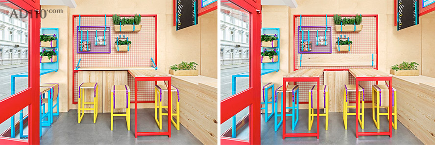 地中海式的花盆让室内充满关于水果和蔬菜的回忆。节省空间的高脚蹬与可灵活移动的桌面结合起来,为店铺提供灵活多变的服务模式。