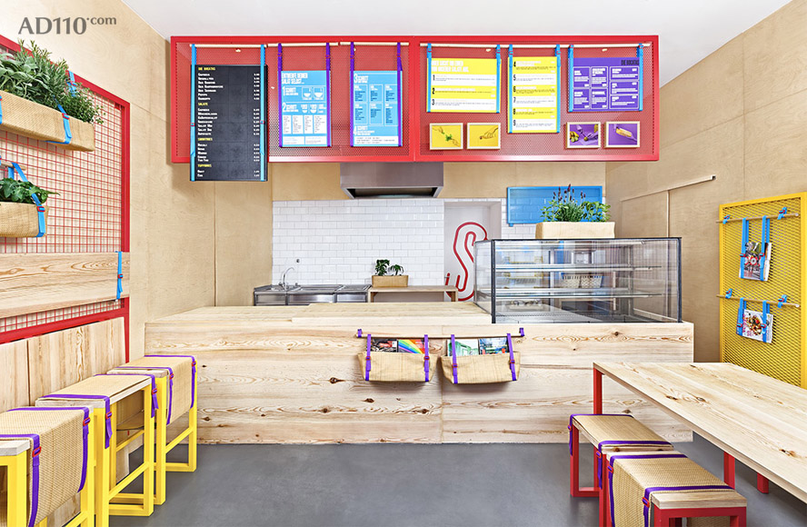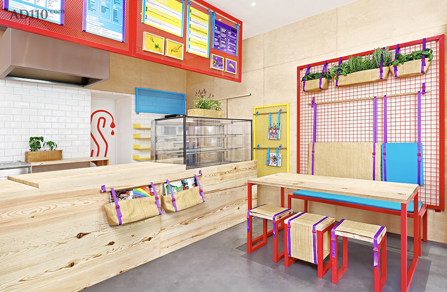 西班牙创意工作室 Masquespacio 首次走出国门,在德国波恩市为地中海美食品牌 Kessalao 设计了一个五彩斑斓超级炫的品牌零售店室内设计。一系列流行色彩被运用其中。热情的红色是主色调,象征地中海的海蓝色和黄色位居其后。同样热情奔放的紫色与红色碰撞在一起,在结合自然的桦木贴面,好一个亮眼又天然的颜色铺子。