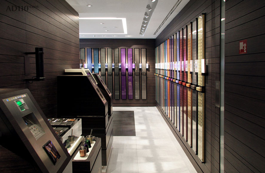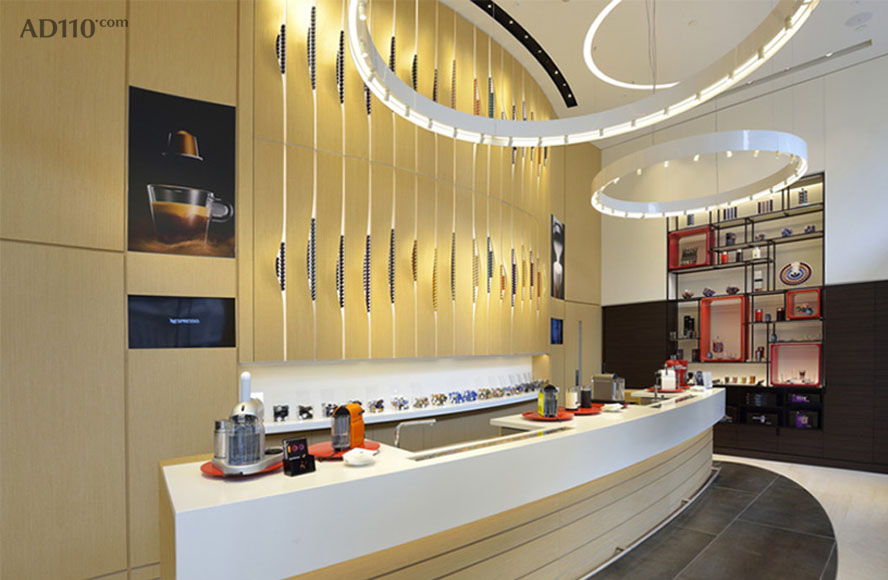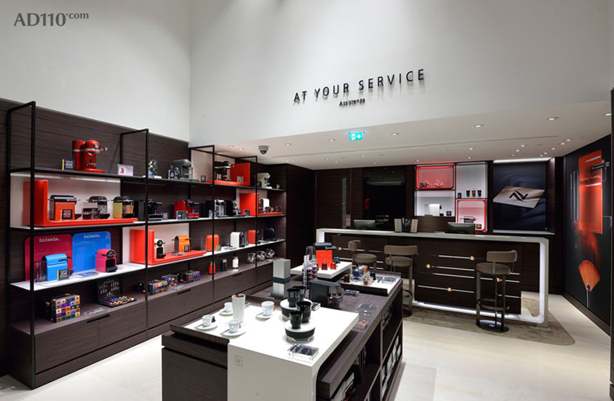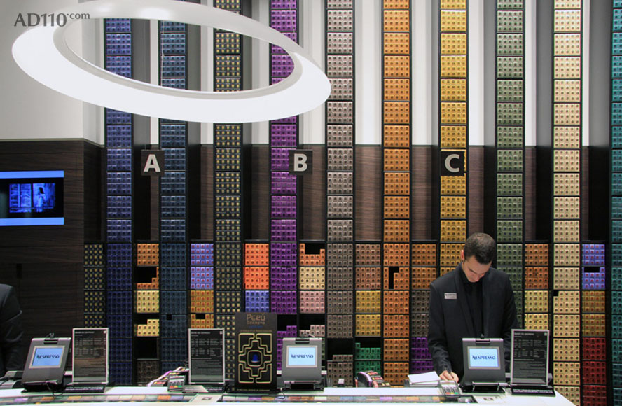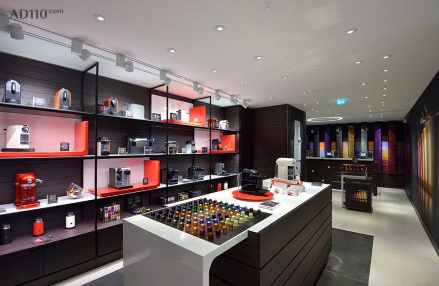 整体内饰空间的设计极尽简约,设计团队以 Nespresso 标志性的胶囊咖啡机为灵感,砌成了一面高墙,一走入店内就给人很强的视觉冲击力。而氤氲在整个空间内的咖啡香气也挑逗着顾客的购买欲。其实,在欧洲, Nespresso 的很多精品店铺里就是只卖机器跟胶囊而已,很少的一部分店会拓展出咖啡馆的空间,但其简单又醒目的店铺装饰就总是有办法吸引路人进去逛一逛。