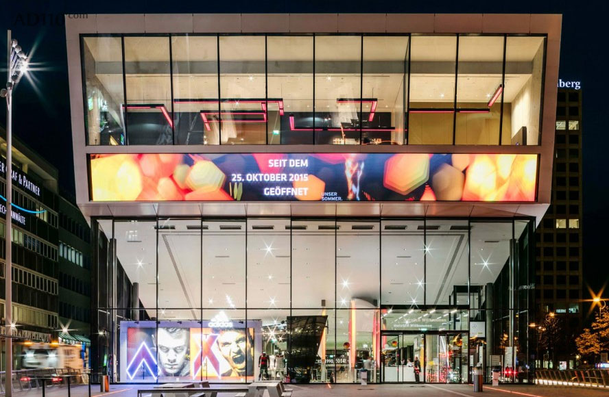 悬挑的结构和楔形切口的设想来源于国王墙大道的城市背景和由柏林德立策划的展览空间。建筑的外形主要受到三个元素的影响: 自由悬浮的建筑主体, 连续开阔的公共空间和底座。 后者是最主要的元素, 尤其是结合周边的环境, 展示欢迎的姿态。建筑的外立面清晰地告诉人们,这里是德国人最热衷的足球运动主题圣地。立面上不规则的铝板穿孔展示出足球的纹理,并设有LED照明。 一副传统足球的图形, 透过方形的空洞展现出来,两层立面之间的画副可根据需要随意更换。正立面的扁长型LED屏幕,完善了这座体验式建筑的外型。