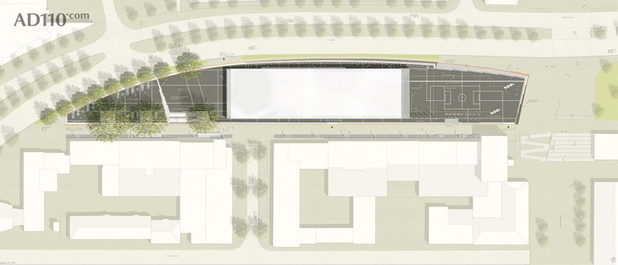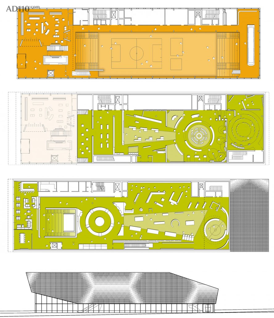 来访者通过广场进入博物馆的前厅, 此处被设计成悬挑的大空间, 作为城市空间的延展。 穿过售票处和球迷商店, 来访者可以通过扶梯到达二楼的展厅。 一楼的“球场”则可用来举行临时的展览和活动,还可以安置餐饮设施。