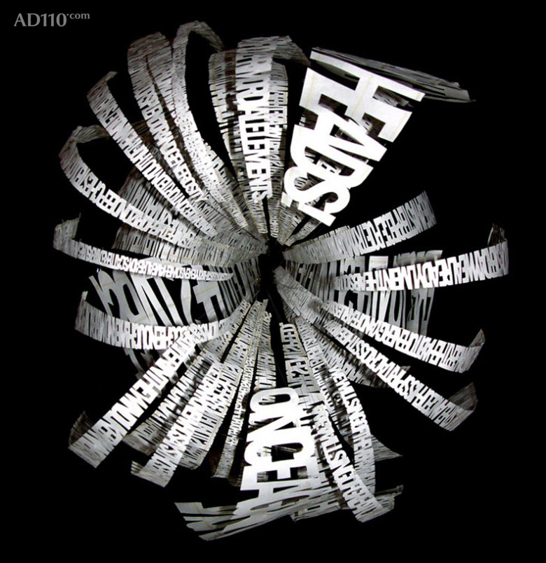 Heath创作初衷:尝试将无形物质可视化,比如在周围声音里,幻想与现实间注入一种形式。而他的视觉之旅通常始于一个问题或者字母。例如:“怎样把我们的肢体语言融入到排版语言中?”(肢体语言:像我们的跳跃,大声尖叫或细声耳语,舞蹈,平躺,死亡和休眠等等)。我们每天都在使用文字,却较少欣赏。从页面的局限中把文字解放,不仅能让文字在尺度,体量和动势等新层面上去表达内容,还能把读者转变为观者,从多个空间角度去观看文字。