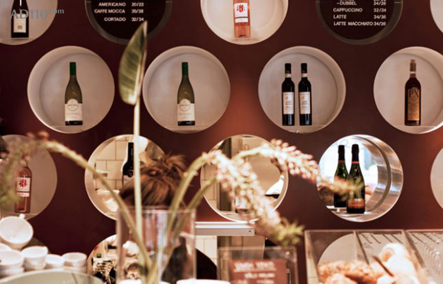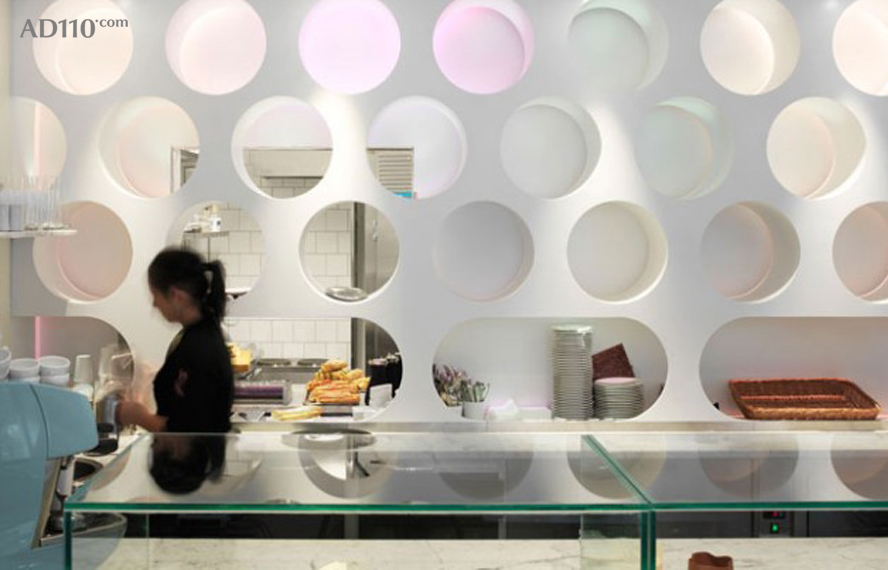 基于Magnus对甜点的想法列出了许多标志,但最后确定的标志是某次会议上我在纸巾上的一个草稿。虽为随意画作,但是设计师对于一个由简单线条组成的标志(标志中有三条线)十分热衷。面包店里的墙上有许多洞是因为建筑师希望Magnus用面包来把它填满。这种圆形最后成为此次创造视觉形象的图形元素,也以此决定了专用字体:Avant Garde Medium。设计师还设计了不同的渐变来表达季节的变更。