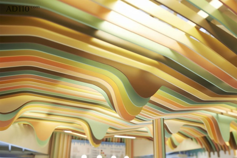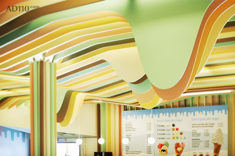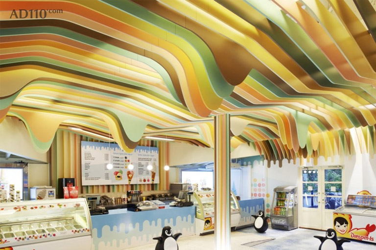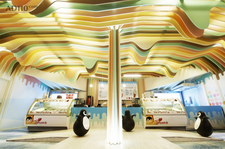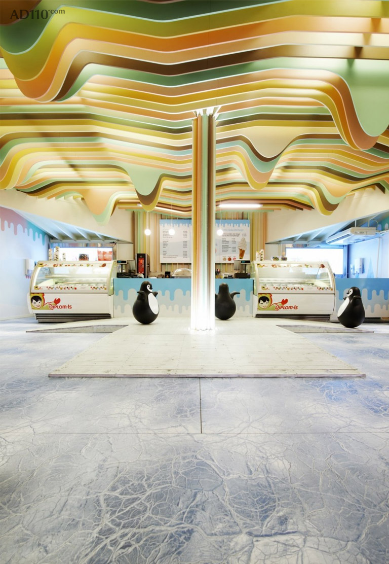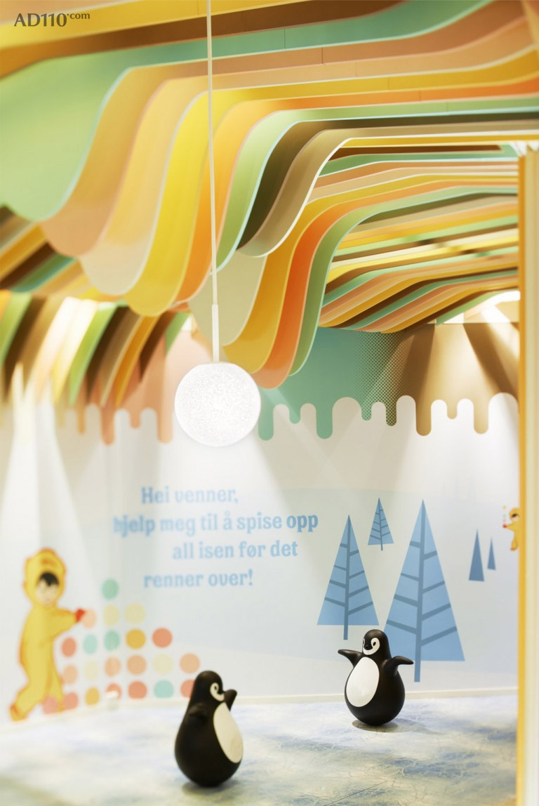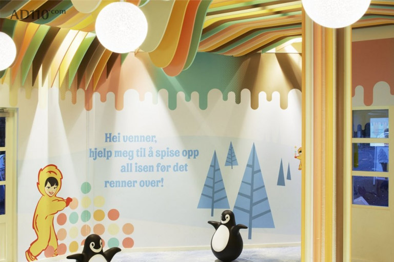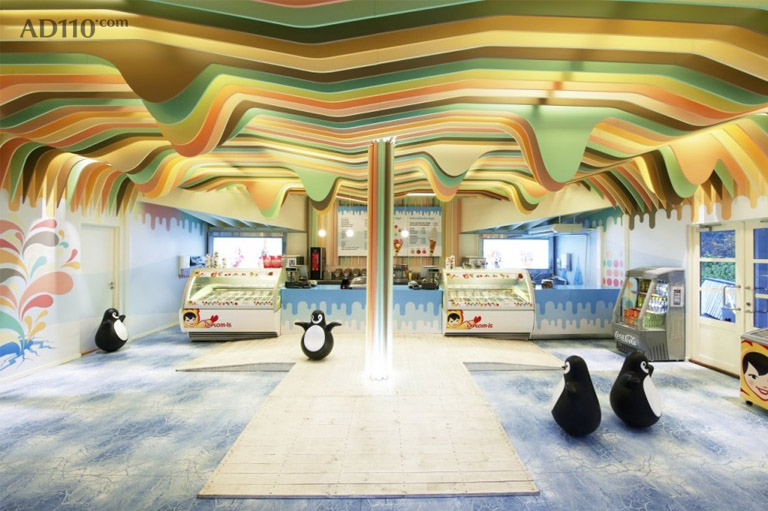 这是一家位于挪威的冰激凌店:冰激凌童话城堡,设计来源于一个童话故事,外观采用香草色,与它所在的游乐场形成鲜明对比,各种图案的地板和墙壁烘托了整个室内的气氛,从内到外完全变成一个冰淇淋城堡。同时地板也制作成光滑的冰状,柜台前面还有一个小的木质渔船。这样,小孩子站上去就会有一个合适的高度,会让他们觉得和大人一般高。Tables Magis企鹅玩具非常有趣,可以在冰上舞蹈。