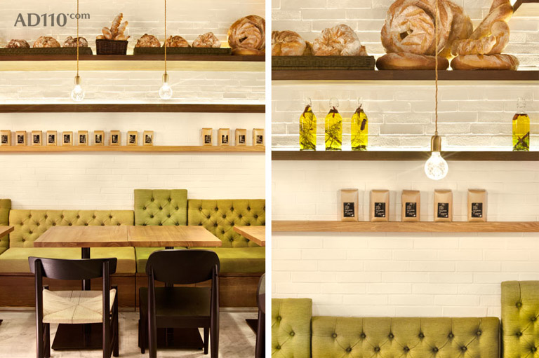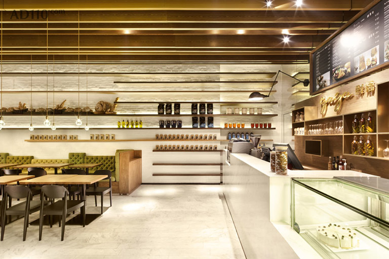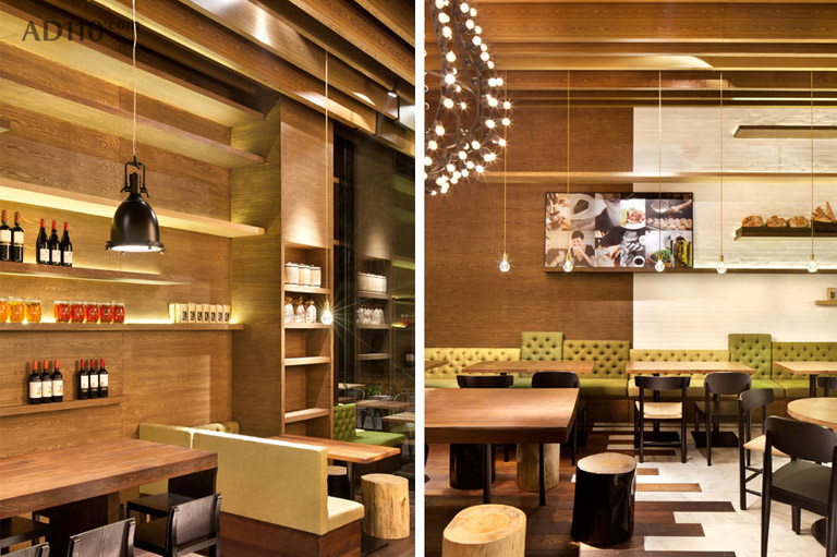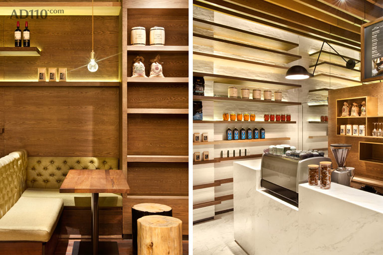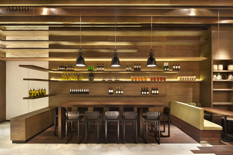 些仿佛如同一缕缕阳光从店内破涌而出。木饰板沿着墙面延伸形成了商品的货架。大型的吊灯通过乒乓球大小的灯泡装点,与幽暗的灯光和轻柔的爵士乐共同营造出酒廊的氛围。室外的木地板延伸进入室内,逐渐转化为流畅的水泥质感地面。