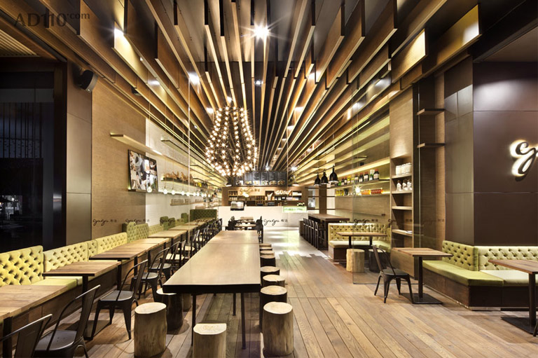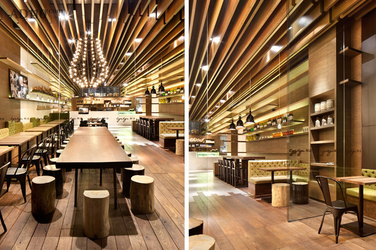 COORDINATION ASIA 创作完成,gaga鲜语代表年轻,新鲜,现代以及时尚前沿的品牌形象,COORDINATION 为gaga设计的新商铺运用了现有品牌的主题颜色。整体氛围温暖,自然舒适。实木材质,柔软的针织材料河绿色的植物装点都为整个空间营造了一份平静休闲的和谐环境。 新的室内设计的主要概念在于“穿越边界”的概念,通过定制的天花板木饰板装置来表现,这