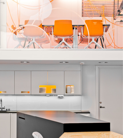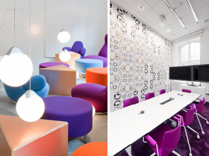 这是一个集视频工作室、音频工作室、会议室、工作区和休息区的综合办公空间,每个房间使用了不一样的颜色搭配,设计师巧妙地用菱形拼色地毯和硬质家具将不同的工作区域串联在一起。Skype的标志性视觉元素在1,680平方米的办公空间里得到趣味盎然的新表达,无论是白色电线拼凑于墙面上的Skype logo,还是始终贯穿于整体空间中的云形灯饰。会议室壁纸上的麦克风、电缆和耳机图案暗喻着这里的工作内容以视频和音频研发为主,而休息区里明快的色调和软质家具则传达了欢乐动感的办公气氛,逗趣沙发椅和坠落在身边的云形吊灯,一时之间扬起了梦幻、幸福的味道。