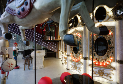 巨大的黑色咖啡杯,灯光璀璨的前台和检票闸口,奥美员工就是从这里进入公司开启每一天的广告梦想,将办公室设计成游乐场的方案正是由他们自己投票决定的。小小两个摩天轮舱,一上一下挂在入口正对面的墙上,私人会客时在里面聊聊天正好。一楼的一侧是个以旋转木马为主题的公共空间,这里有胡桃匣子还有六个敦实可爱的红色沙发椅。同时,旋转木马也出现在会议室、图书室和会客房间内,一种童话般的气息便应运而生。与游乐场一致的是,办公室还提供爆米花和游乐设备,工作之余最受大家欢迎的桌上足球总能引来一阵阵欢呼。如此办公空间,正是奥美人所期待的——一个梦想与创意的萌发地。
