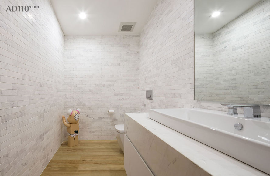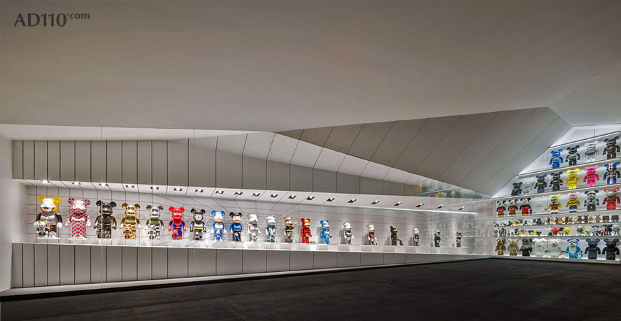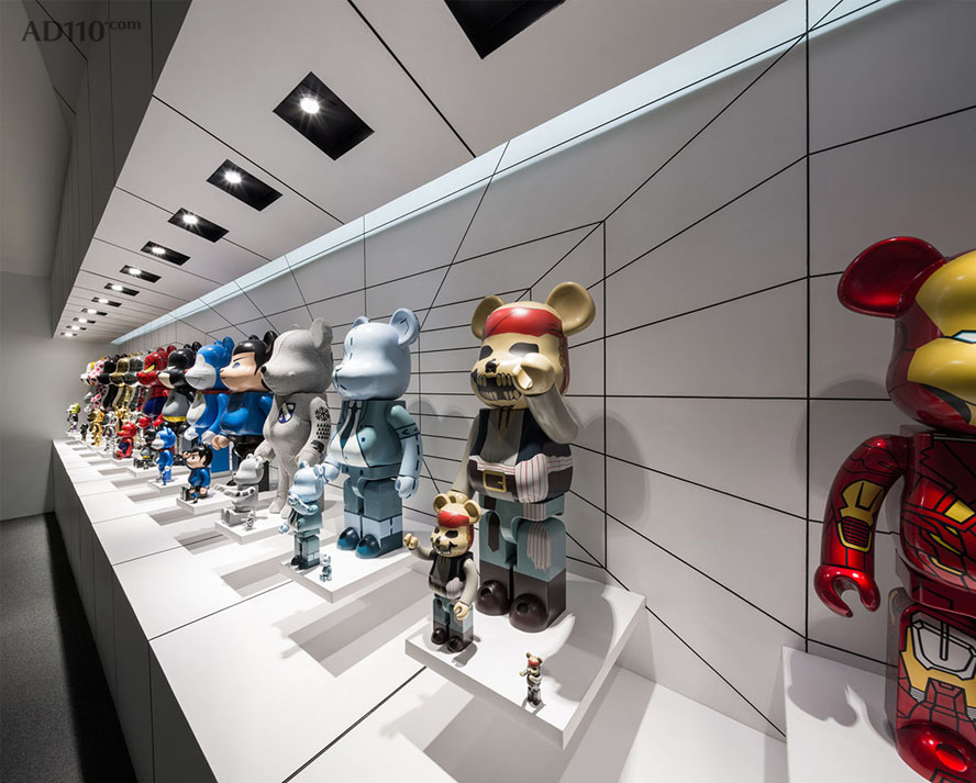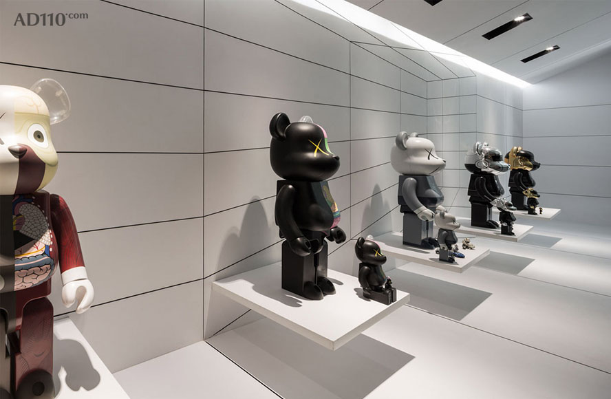 Be@rbrick橱窗为小熊车库带来了光亮,在某种程度上颠覆了整个空间环境。以不同角度折叠的橱窗天花板投映到整个车库天花板上。陡峭的倾斜状天花板从橱窗内一直延伸到橱窗外。灰色的阴影将视线引向明亮的区域—Be@rbrick展示橱窗。此时,小熊车库已不再是单纯的汽车存放库。