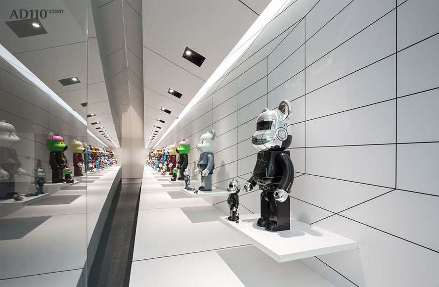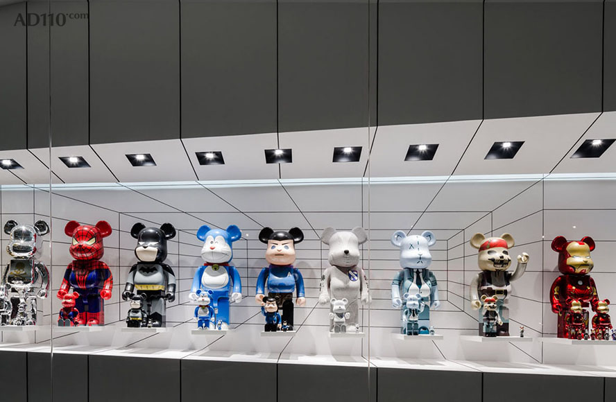 店面的构想将这两种设计方案连接起来。整个Be@rbrick橱窗明亮炫白,创造出高端奢华的感觉。短边橱窗上下安装了LED灯条。1000% Be@rbrick搁板上部灯条的数量要多于100% Be@rbrick以便形成均匀的光照度。长边部分有两种照明系统,即LED灯条和LED射灯。灯条安装在天花板和后墙之间,一部分隐藏起来,而另一部分在倾斜的天花板边缘显露出来。射灯安装在黑色方形凹盒内,其尺寸和间隙沿着L形橱窗结合点不断增大。射灯精确地安装在每个1000% Be@rbrick公仔的上方。灯光系统强化了视觉错觉的效果。