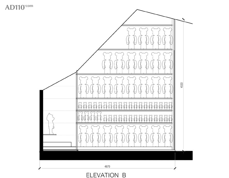 L形橱窗的较短边的布局更为简单。其目的是为了尽可能多地展示Be@rbrick公仔。这片仅有4.8米高的有限空间内至少展示了70只公仔,它们在搁架上紧挨在一起,形成流畅的整体布局。从斜线角度看向橱窗时,70只公仔形成了多彩的背景。