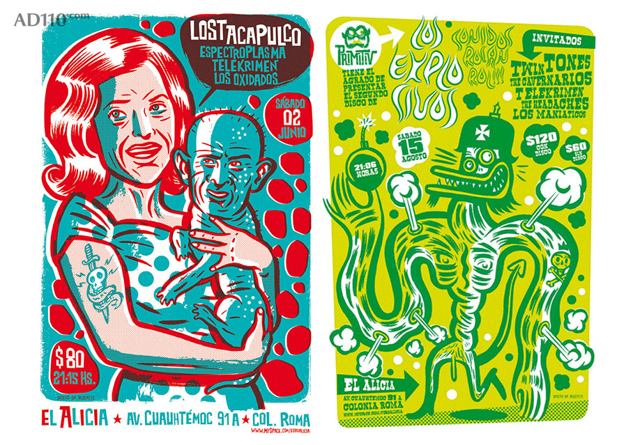 在我记忆中,音乐对我的作品有很深的影响,摇滚乐、朋克、冲浪音乐、山村摇滚,通过这些音乐我依次从中发掘出恐惧、夜生活、汽车及流行文化等主题。在我搬到墨西哥后,我开始为一些乐队和音乐场馆制作宣传插画,这也是我一直以来的梦想。