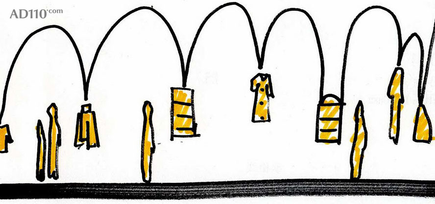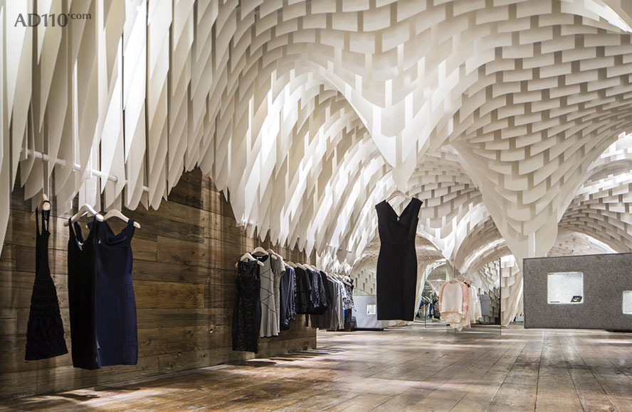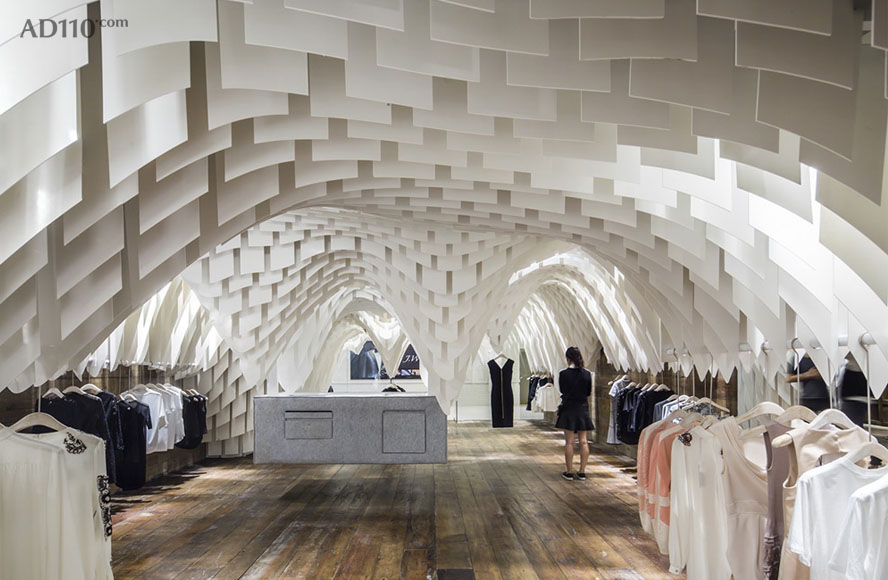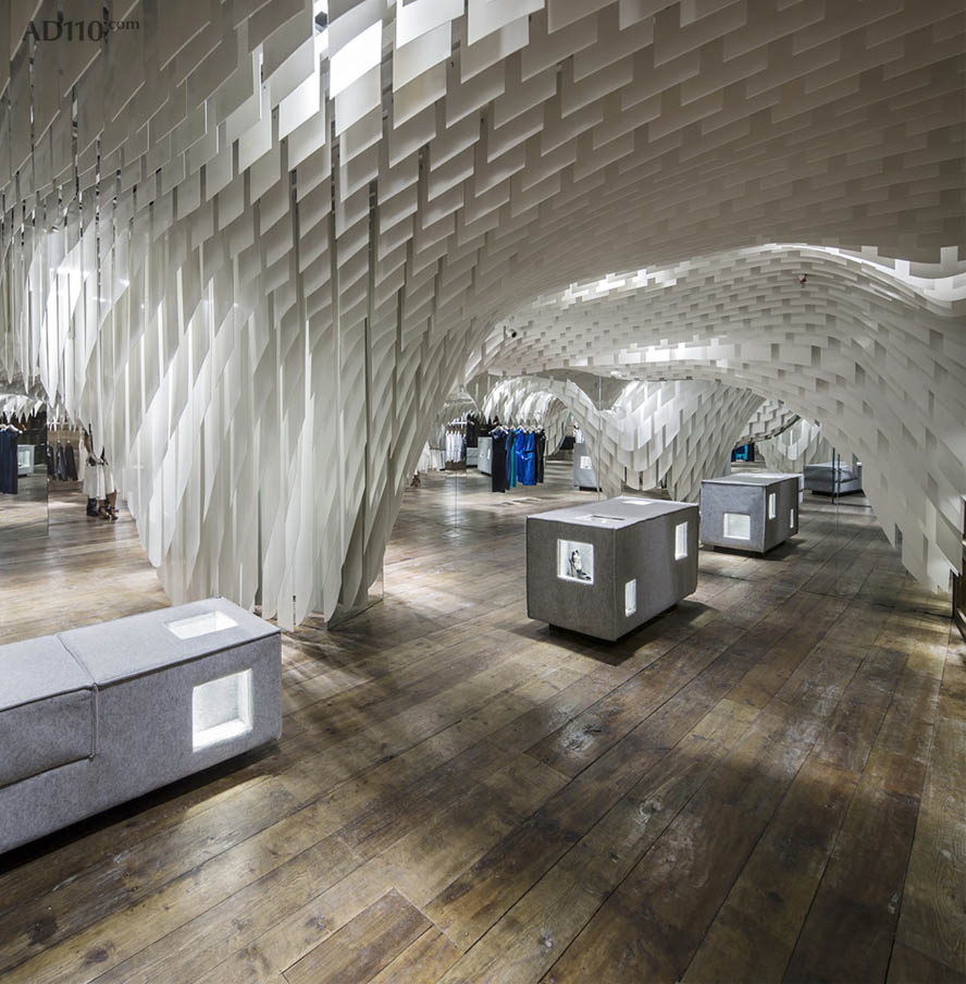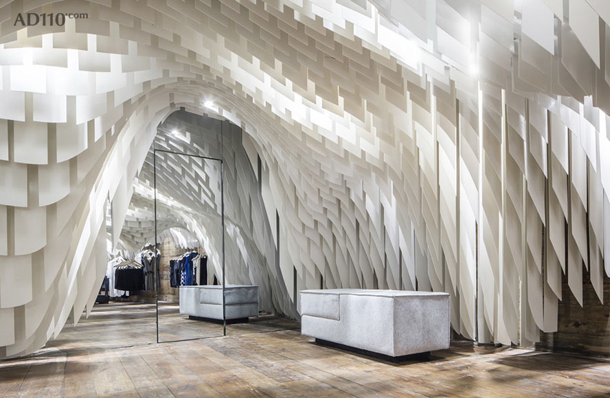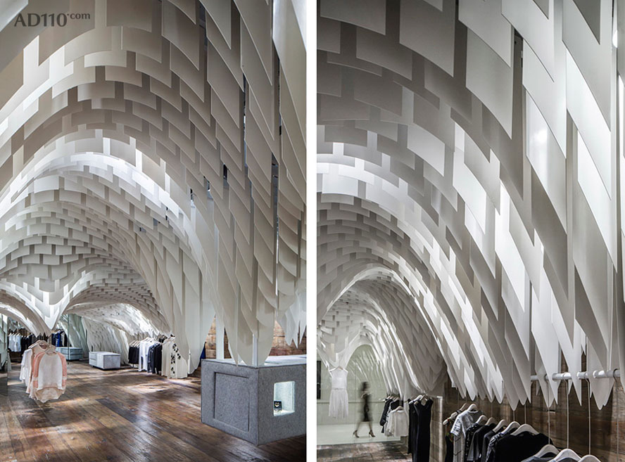 3GATTI 在描述其创作构想时这样写到:当我开始这个店铺的设计构思时,我只有一个简单却又引人入胜的想法,那就是所有的设计元素都将“从天而降”- 因此顾客将有充足自由的购物浏览空间而不被一般店铺底面中所摆放的家具和销售单品所阻碍。首先我们使用一个模型软件来模仿用材的物理特性,创造出一个可拉伸有张力的天花吊顶仿佛真实地被各类物件的重量所影响从而垂坠了下来。其次我们考虑到了店铺中所必须的一些设备例如照明、音响、消防喷淋、摄像头、空调和通风等,所以“可渗透”型的半开式吊顶外观想法则理所应当的浮出了水面。以上则是垂坠吊顶的创作本意,好似对转瞬即逝商品的片刻拥抱支撑。