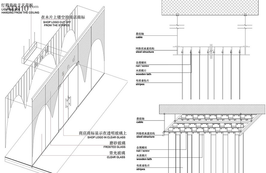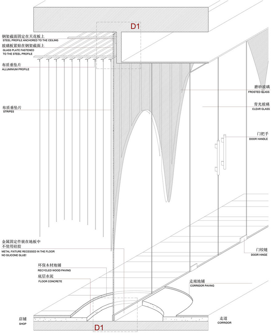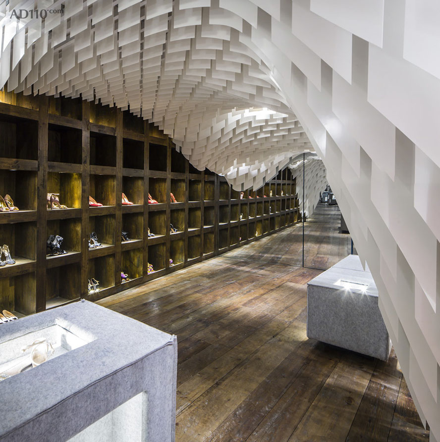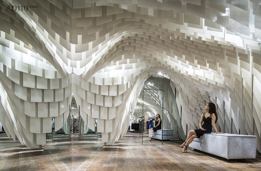 我们提供给了厂家数以万计将从天而降不同形状的垂坠片文件,幸好最终可以快速镭射切割这些垂坠片而不用施工方一片片手工切割。我们之所以使用极薄半透明玻璃纤维的原因在于该材料不仅有极高的阻燃性,同时还能反射灯光从而达到精彩壮观的照明效果,而最终创造出空灵柔美的天花吊顶景观设计,为所有“时尚的羔羊”提供了无与伦比的购物氛围。尽管店铺的面积规模不大上万片的垂坠片又绵延不绝,但是设计中安置的镜面玻璃巧妙地缓解了这个问题,与此同时还创造出了飘渺的内部环境让购物者忘我并迷失于这片时尚“帘洞”中。