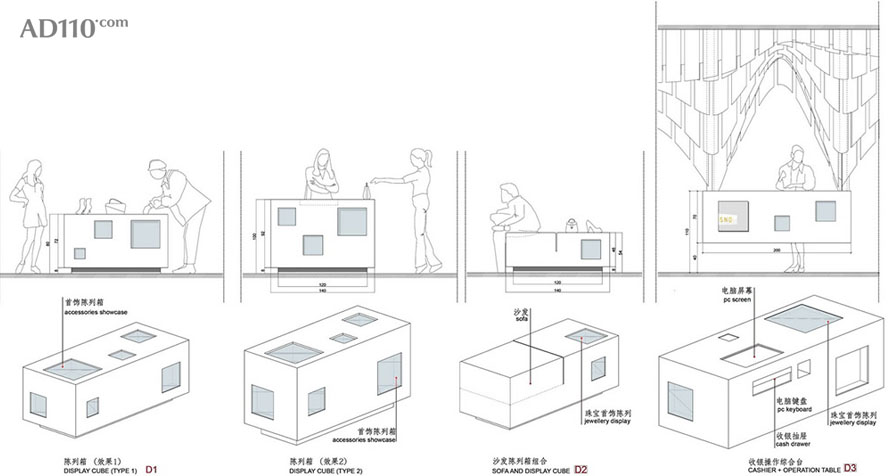 项目简述:时尚店铺,展示区域包括:服装、鞋类、首饰、眼镜、设计单品、书籍,休息区,DJ台, 2间试衣间,办公区域。