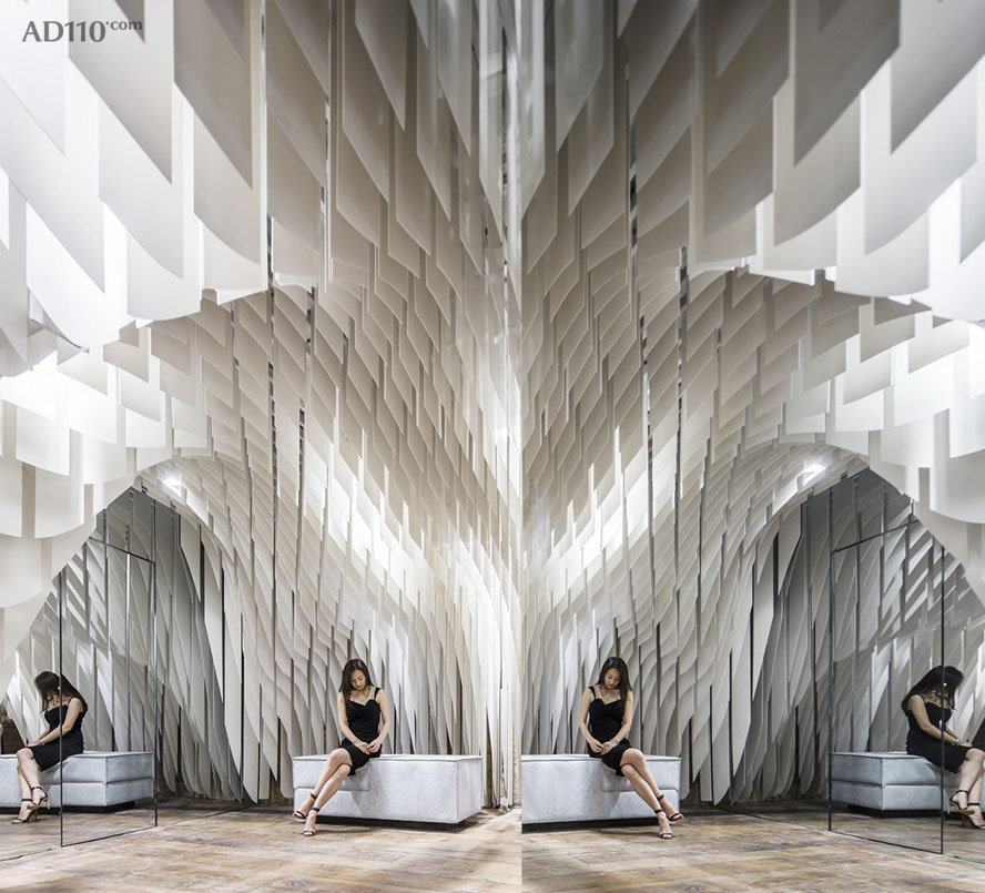 这片谜样的天空垂坠片无疑是该空间的绝对主角,因此我们使用了回收木材装点室内铺地及墙面而从在整体环境中更凸显坠片所制造的“幻境”。另外,我们也为店铺设计了实用的“毛毡箱”用来作为店内唯一提供沙发,收银台,陈列柜等功能性的家具组件。最后,店铺外立面仅用半透明的磨砂玻璃来映衬出店内垂坠片剖面图,从而创造出简约但壮观的外观效果来吸引更多于重庆WFC商场中流连的访客。