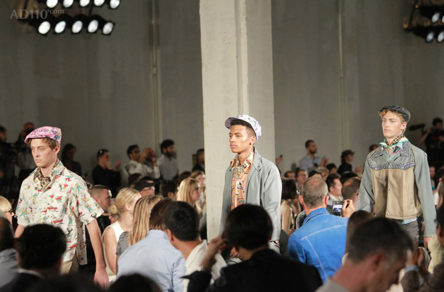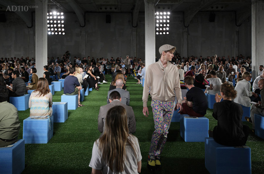 此次场地与以往不同的是,观众席座是由600个1.5m×1.5m蓝色泡沫方块构成,有序组成网格散布在米兰T台中。而方块之间的区域则变成了模特走秀的T台,此种设计自然使得观众与走秀过程完美融合。