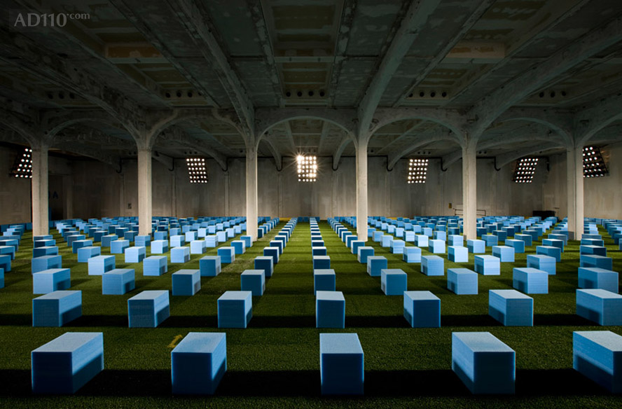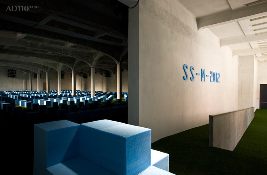 座位的节奏感使得巨大的历史建筑极具雕塑般的空间效果。人工草坪与蓝色的泡沫方块对比,为室内带来一抹野外气息。建筑本身粗犷而单一的混凝土墙面放大了整个T台装置的色彩饱和度。