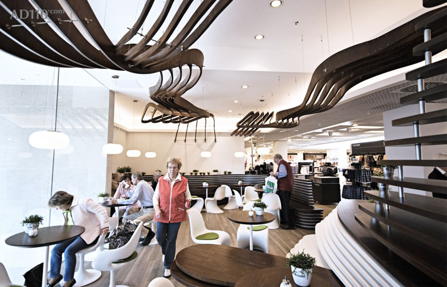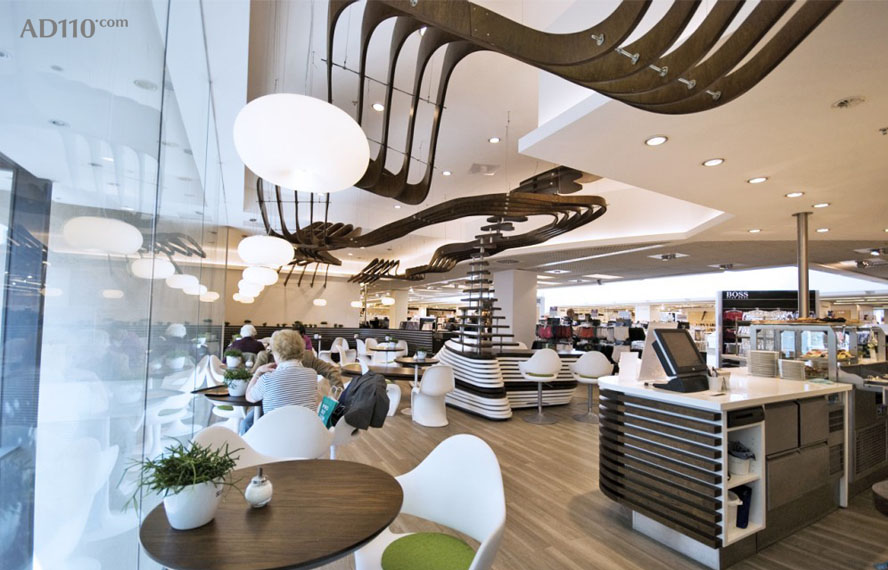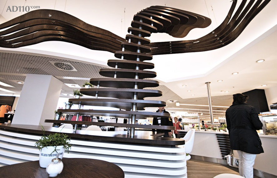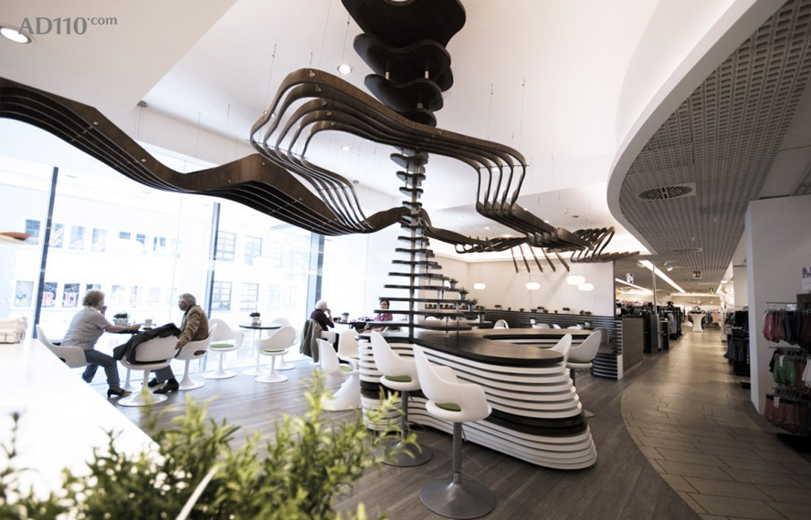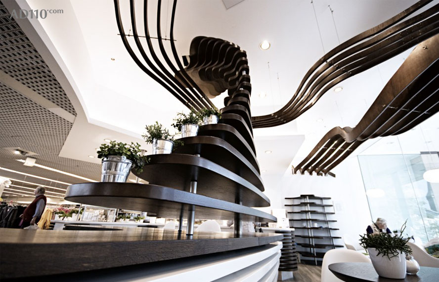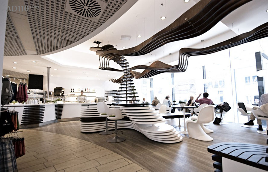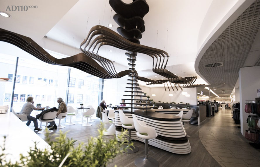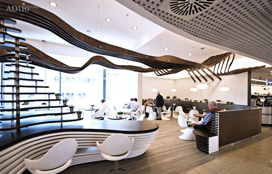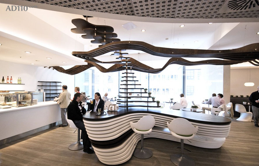 其中最大的亮点来自于复合波浪结构的天花吊顶,结构独特,视感新颖。