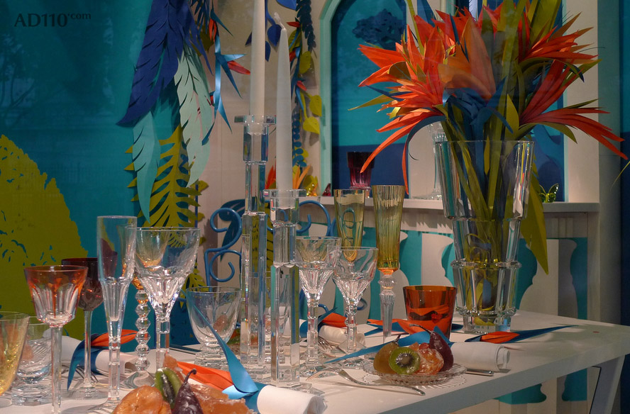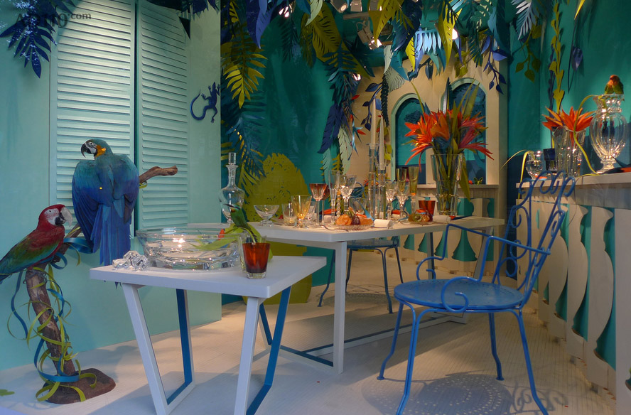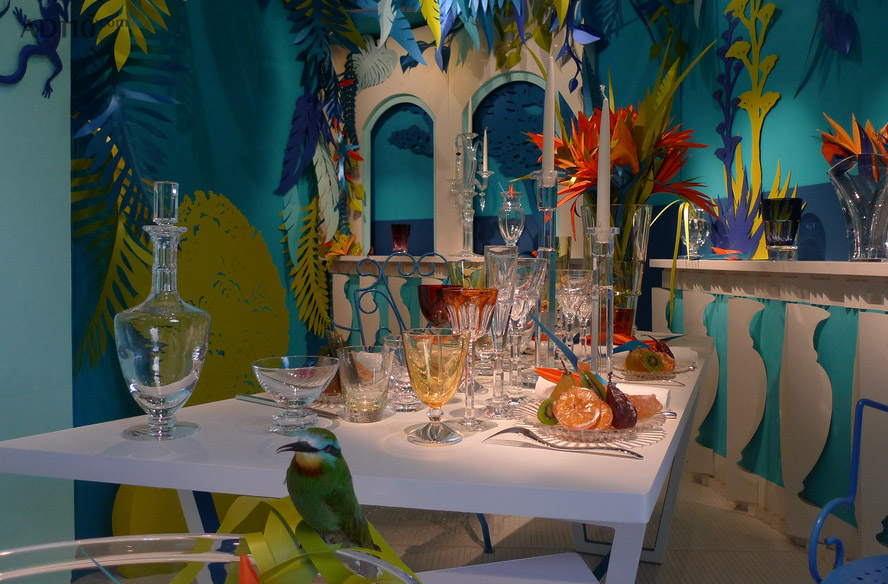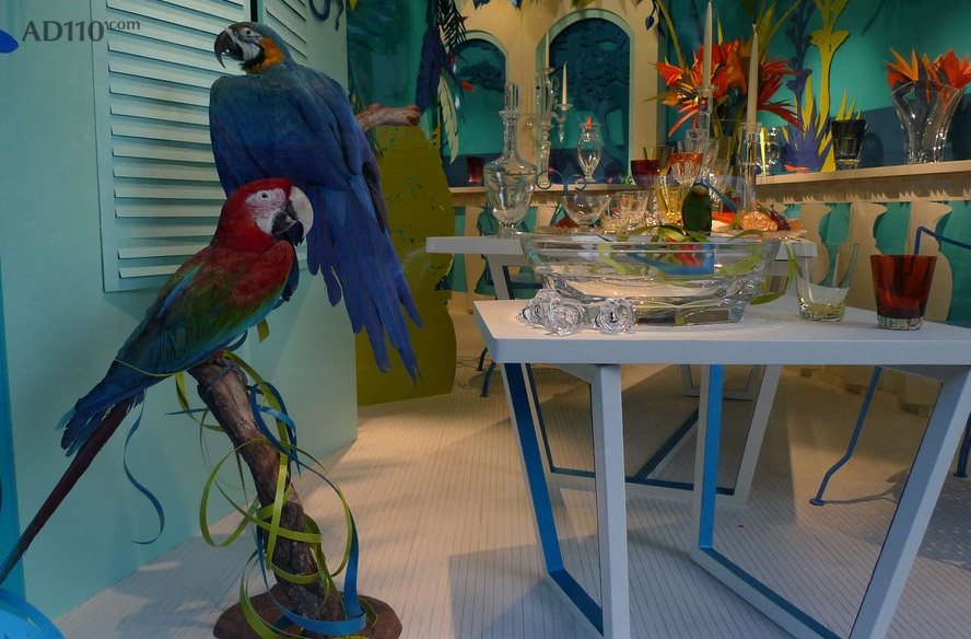 著名奢侈家居品牌Baccarat 2011年秋冬产品陈列主题是“异国情调,野生动物天堂”设计师在设计橱窗时采用了浓烈的天然色彩和动植物组合,使整个家居用品置身于“异国情调,野生动物天堂”中,在巴黎Baccarat专卖店中显得十分艳丽夺目!