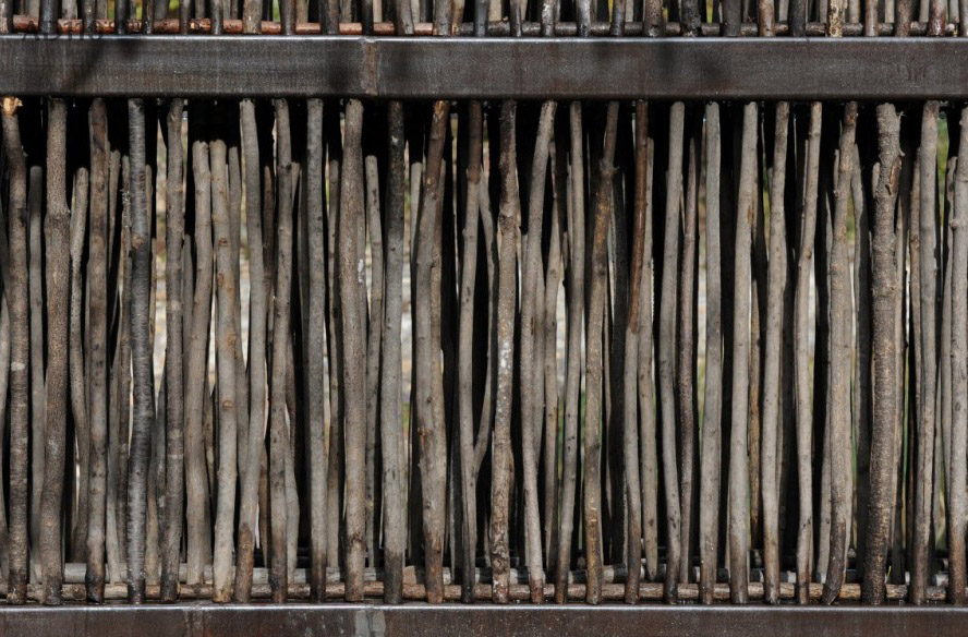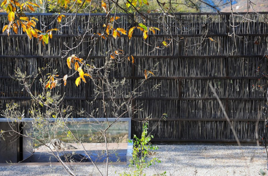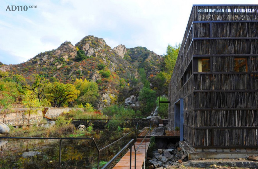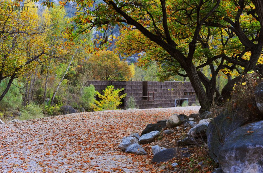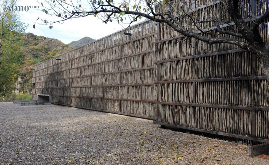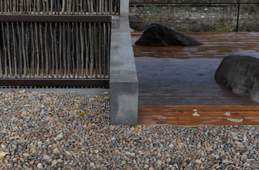 篱苑书屋所处基地背山面水,景色清幽,一派自然的松散。设计构思旨在与自然相配合,让人造的物质环境,将大自然清散的景气凝聚成为一个有灵性的气场,营造人与自然和谐共处、天人合一的清境。场地前的水面,水边栈道、卵石平展的铺排以及篱笆(取自漫山遍野的劈柴混)围合的空间,让