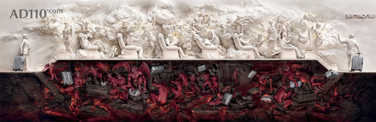 “地狱与天堂”是JWT 智威汤逊上海办公室为Samsonite(新秀丽)创作的广告传播作品,不过Samsonite(新秀丽)最后没有采纳该作品,据说客户觉得不吉利[shuai],从创作角度来说,这件作品实为佳作,画面细腻,创意十足[tong]