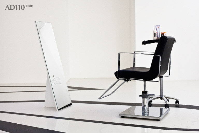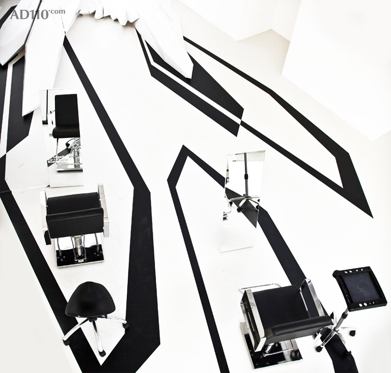 座位会顺着墙面摆放,而在这个空间中每个理发座位都被放置在中心位置,由粗的多边形轮廓线界定,为这个黑白空间增添了灵活的平面元素。这间美发中心是一个临时空间,只营业到9月21日,而且只接受预定顾客——尽管公众可以自由的观看沙龙内部——它位于由zaha hadid设计的4,800平方英尺的设计美术馆中,现在正举办fudge公司的产品展览,作为伦敦设计节的一部分。