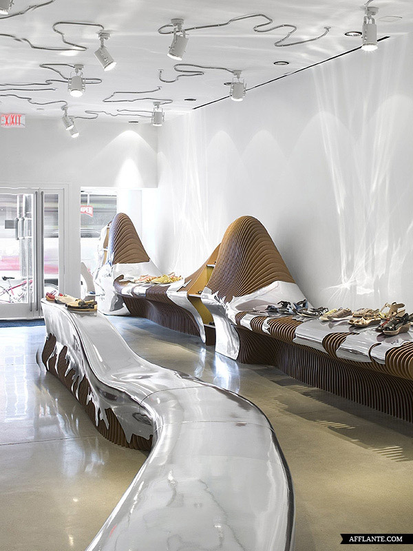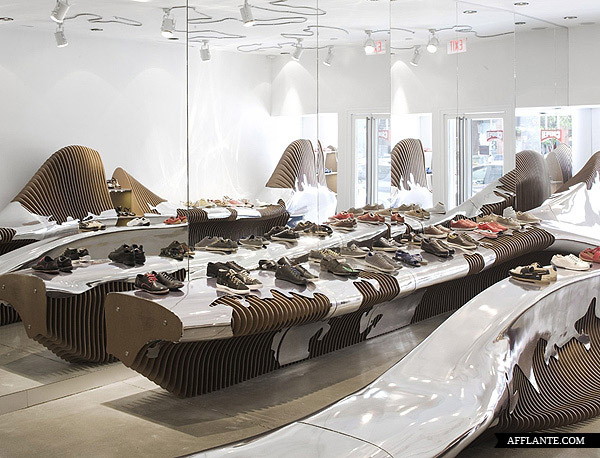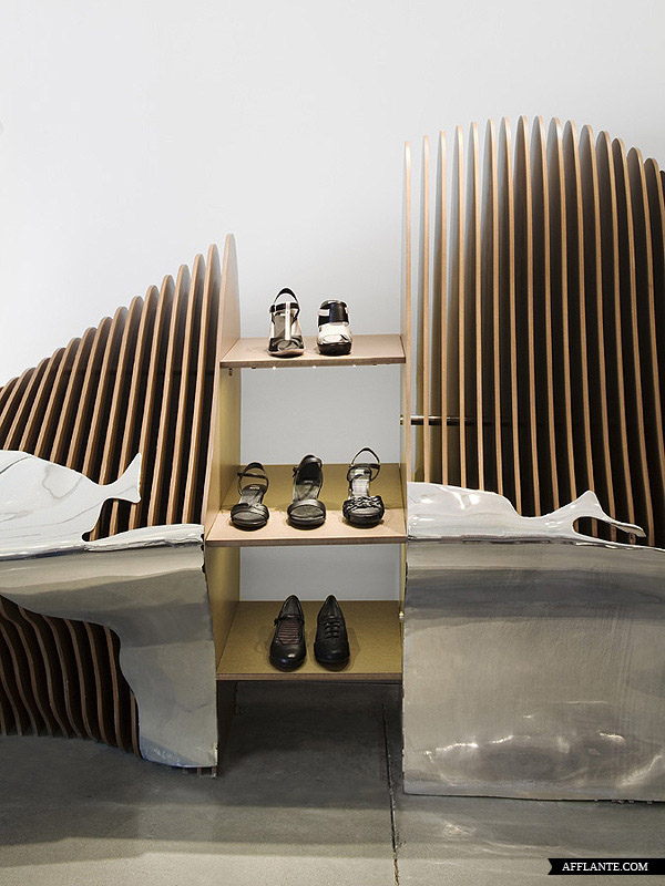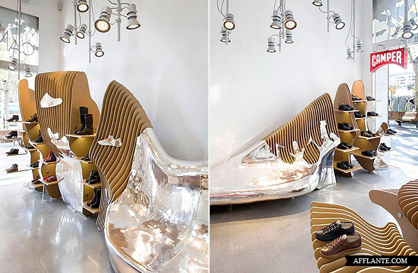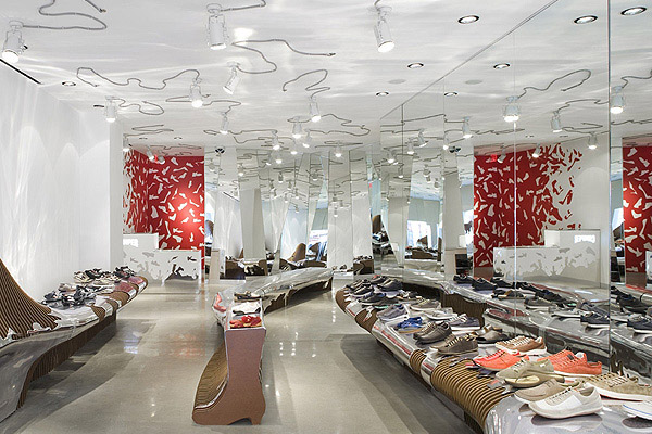Camper Shoe 每开一家新店均邀请不同的设计师或艺术家为其进行惊世骇俗的创作,去年底他们在华盛顿开设一家专卖店,邀请到西班牙建筑师 Benedetta Tagliabue 进行全新的创作。Benedetta Tagliabue 采用超有感觉的镜面设计,搭配独特的照明,使整个店内达到前所未有的颠覆。