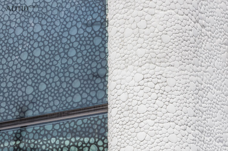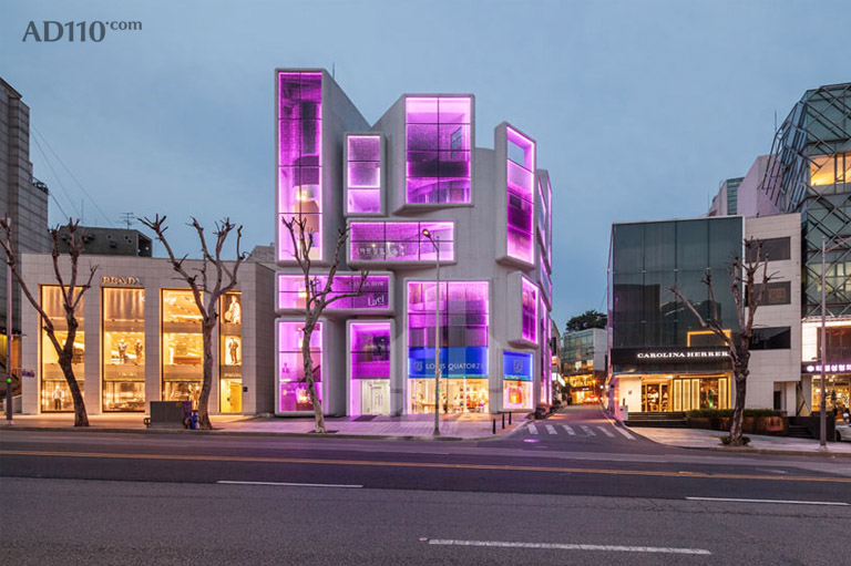 MVRDV重塑了这座大厦的形态,把一系列凸出的店铺橱窗嵌入在外立面上,显示了chungha大厦的多重属性和特点。建筑师发现曲线形的外墙面最适合这些不同大小的开窗,搭配白色的马赛克瓷砖——从近处看好像白色的泡沫,从远处看就变成光滑的石头——这个设计成为一种独特的材料,覆盖了原有的浅褐色的立面。彩色LED灯的运用完全改变了这座多功能建筑的外观,让每个窗户在夜间闪闪发光,分外突出。这个改造项目仅用了9个月时间,最大的挑战就是紧凑的基地现状。这座5层高的建筑,最宽的部分只有2.5米,建筑需要把自己挤压在非常狭窄的空间中。