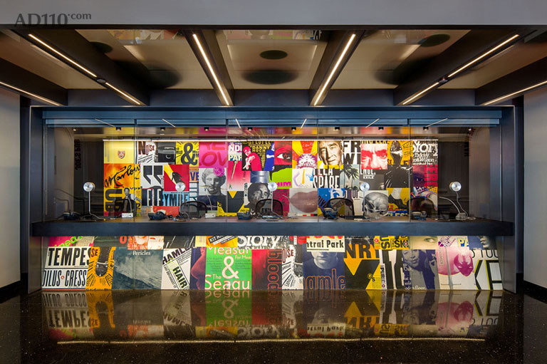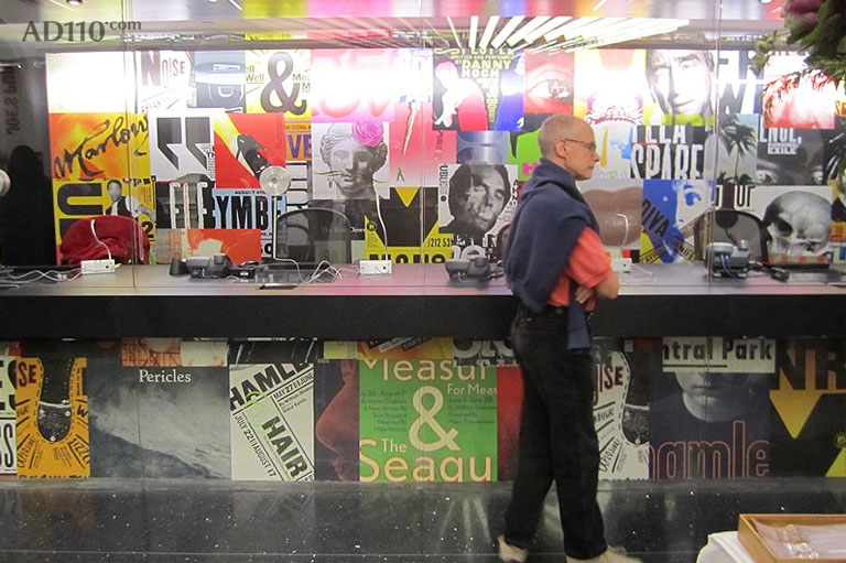 (纽约Public Theater的大堂售票处以Scher的海报作为装饰背景)