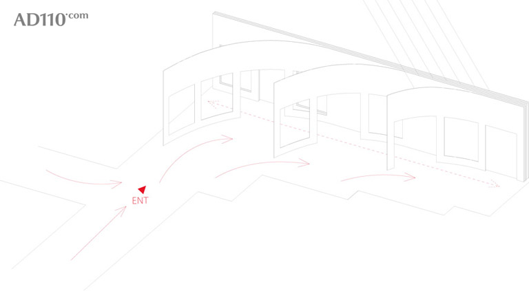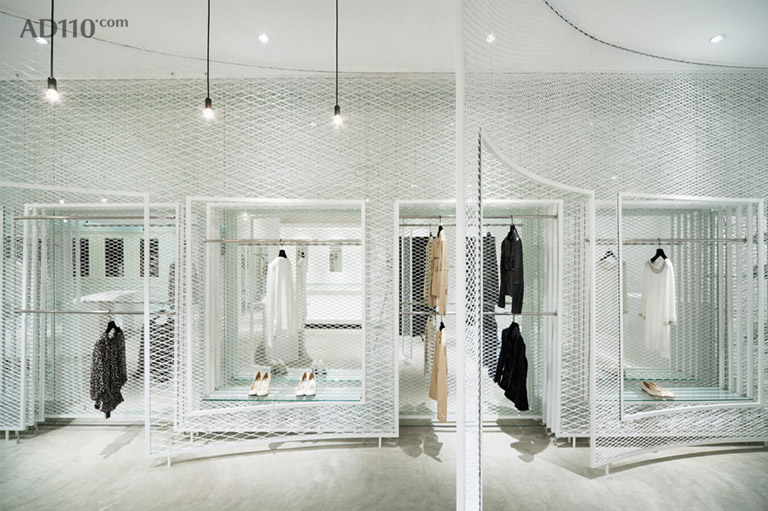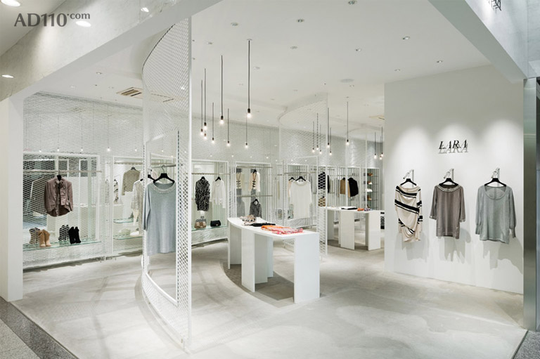 LARA Kanazawa 金泽分店的入口面宽不大,商店布局呈L型,转个弯之后,内部有较深的空间。这种布局属于难以利用的空间,建筑师决定化劣势为优势,利用6层网孔金属墙和一层镜面拓展深度,几面弯弧的网孔金属墙引导人们进入,并能不阻碍人们对空间的视野。