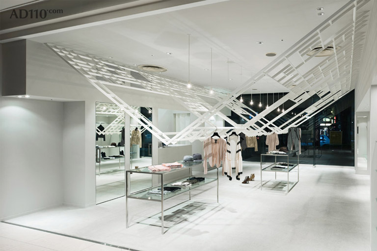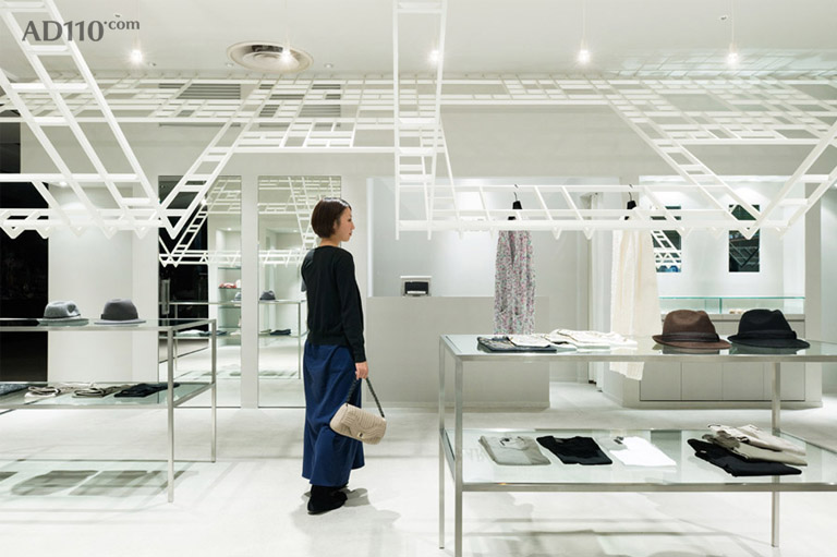 LARA Kofu 甲府分店是某临街大楼的底层商铺,建筑师希望从街道橱窗看进来的视野不被阻拦,在商店天花上安装了一个V型的大格框架。该框架创造可全新的购物体验。